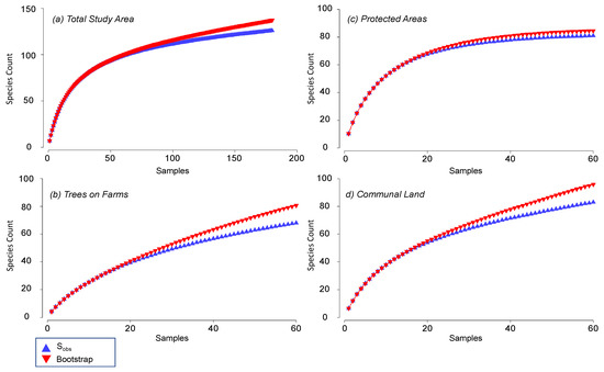 Estimation of actual (SOb) and estimated (Bootstrap) total species richness for (a) the total study area, (b) Trees on farms, (c) Protected areas, (d) Communal Land.