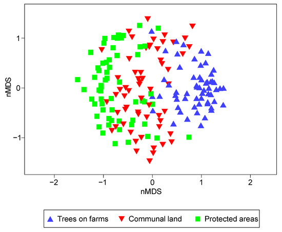 Figure 3 shows the result of the nMDS tree species richness assemblage. Distinct clustering can be seen between categories, showing a limited overlap for trees on farms and protected areas, while the communal land shares species with both categories.
