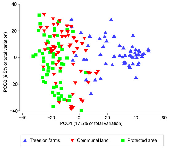 The homogeneity of multivariate dispersion (PERMDISP) results showed a significant difference in species variation among the land-uses (F = 15.79, p ≤ 0.001). The PERMDISP pairwise comparisons support the significant difference in land-uses (Table 4). The trees on farms category differed significantly from communal land (t = 4.4022, p ≤ 0.001). Likewise, the trees on farms differed significantly from protected areas (t = 4.2802, p ≤ 0.001). The species variation of communal land and a protected area was not statistically distinct (t = 0.45084, p = 0.673). The species richness variation average dissimilarity within the land-uses was 45% at trees on farms, 52% on communal land and 51% in protected areas (Table 4). The PCO explained 27% of the variation among the land-uses—9.5% and 17.5%, respectively, between axes (Figure 4).