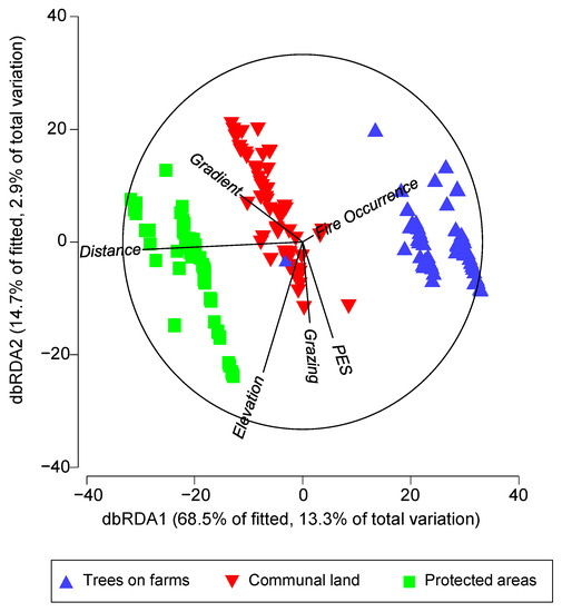 The DISTLM results showed that there was a significant correlation between species richness and most of the socio-ecological factors examined (R2 = 0.194, p ≤ 0.001). The marginal test showed a significant relationship (p ≤ 0.001) between species richness (all land-uses) and most socio-ecological factors (elevation, gradient, PES harvesting, grazing and distance), except for fire occurrence (p = 0.384). The variations explained by each variable are as follows: distance (12.2%), elevation (2.6%), gradient (5.5%), fire occurrence (0.6%), grazing (1.6%) and PES harvesting (1.5%) and as shown in Table 5. The first two axes of dbRDA captured 83.2% of the variability in the fitted model and 16.2% of the total variation in the data cloud (Figure 5). Concerning trees on farms, species richness is driven by fire occurrence, grazing and PES harvesting. On communal land, species richness is driven by PES harvesting, gradient, distance, elevation and grazing. The tree species richness in the protected area is driven by distance.