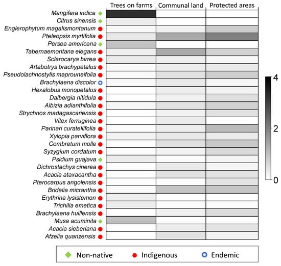 An average dissimilarity of 89% species richness was observed between the communal land and protected areas. A total of 30 of the 126 shared species between the communal land and protected areas contributed above 70% to the average dissimilarity between the two land-uses. The most dominating species in terms of dissimilarity were Pteleopsis myrtifolia (6%), Tabernaemontana elegans (5%), Parinari curatellifolia (4%), Pseudolachnostylis maprouneifolia Pax. (3%) and Combretum molle (3%). The indigenous species Faurea saligna was completely absent in the communal land. The visual impact of the greyscale intensities in a shade plot (Figure 6) gives a strong idea of which species are highly dominated in each land-use. White denotes the absence of that species in that land-use, and full black represents the maximum abundance in the land-use. The shade plot shows the top 30 dominating tree species; the trees on farms were dominated by non-native tree species, while both the communal land and the protected areas were dominated by indigenous species. Notably, only one endemic species was found in the top 30 and was observed only in protected areas.