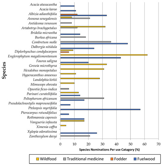 In the FGDs, the participants listed the important tree species based on the utility categories such as fuelwood, fodder, wild food and traditional medicine. Based on species nomination within the FGDs, the most important tree species in each category were evaluated using the fidelity level formula. A full species list is given in Table S1 in the supplementary material. The overall number of citations of the most important tree species varied between 4% and 62% in the use categories (Figure 7). The indigenous species Englerophytum magalismontanum was the most reported tree species (62%) for wild fruits in the study sites, while it was also highly reported for fuelwood utilisation (43%). Pteleopsis myrtifolia was the most described (57%) tree species for fuelwood, while Combretum molle was the most cited (36%) tree species for traditional medicine. Albizia adianthifolia (Schumach.) W.F.Wight was most frequently given (12%) as a species for fodder. From 29 tree species, 8 tree species were cited as multiple purpose species, such as Englerophytum magalismontanum and Parinari curatellifolia (both appearing in the wild food and fuelwood utility categories). Peltophorum africanum Sond. and Combretum molle were suggested in both the traditional medicine and fuelwood utility categories. Artabotrys brachypetalus Benth. and Annona senegalensis Pers. were suggested in both the wild food and traditional medicine utility categories, Diplorhynchus condylocarpon Müll.Arg. was suggested in both the fodder and wild food utility categories and Albizia adianthifolia was recorded in both the fuelwood and fodder utility categories.