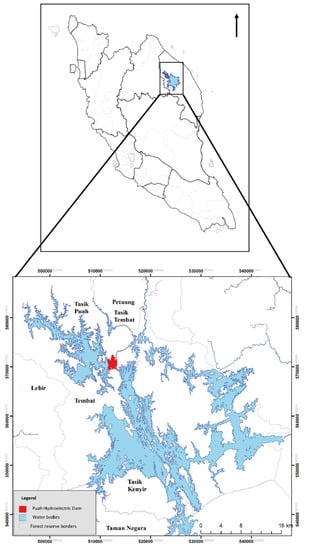 The study site is located at Tembat Forest Reserve (FR), consisting of Tembat and Puah Dams, north of the existing Kenyir Dam in Kuala Berang, Hulu Terengganu, Peninsular Malaysia (Figure 1). It is around 50 km from Gua Musang-Hulu Terengganu highway and around 65 km west of Kuala Terengganu. The estimated terrain elevation of Tembat FR is 284 m above sea level. Its latitude is 5°05′03″ N, and the longitude is 102°44′13″ E. Tembat FR is a part of the Central Forest Spine (CFS), running parallel to the Main Range. Its existence is crucial for biodiversity and environmental protection. The study site can be categorised as a lowland dipterocarp forest to a hill dipterocarp forest in which the altitudes range between 150 m and 420 m.