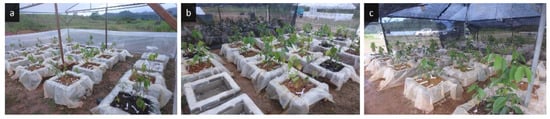 The plant height, stem diameter, number of leaves, and relative chlorophyll concentration were measured monthly for seven months. Plant height was measured from the soil surface until the tips of the upper shoot using a ruler. Using a digital Vernier calliper, the stem diameter was measured 2 cm from the soil surface. A chlorophyll content meter (Hansatech Instruments Ltd., King’s Lynn, Norfolk, UK) was used to measure relative chlorophyll concentration. At the end of the experiment, the shoots and roots of each plant were sampled and immediately dried at 80 °C in an oven for 72 h to measure dry weight and later the biomass accumulation. The leaf area was measured using Image-J software (Version 1.52a, Bethesda, MD, USA). Each young, matured leaf was photographed using a digital camera on a whiteboard with a customised 3 cm scale. Then, the images were processed using the software to obtain the leaf area.