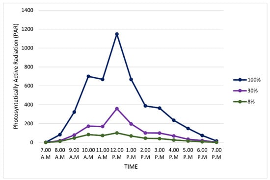 Comparing three different levels of light irradiance, the control showed the highest photosynthetically active radiation (PAR) compared to 30% (single layer of shading) and 8% (double layer of shading) irradiance (Figure 3). The peak of light irradiance was at noon for all light-intensity levels. The control recorded the highest PAR which reached up to 1200 μmol m−2 s−1 followed by 30% (400 μmol m−2 s−1) and 8% (150 μmol m−2 s−1) irradiance.