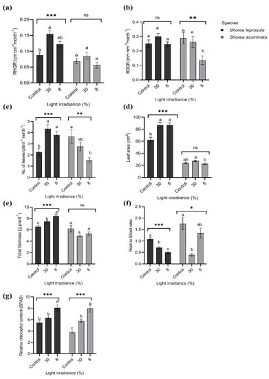 The growth performance of Shorea leprosula Miq. and Shorea acuminata Dyer to different light irradiances; (a) relative height growth rate (RHGR) (cm cm−1 month−1); (b) relative diameter growth rate (RDGR) (mm mm−1 month−1); (c) mean number of leaves (plant−1 month−1); (d) leaf area (cm2); (e) biomass (g plant−1); (f) root-to-shoot ratio; and (g) relative chlorophyll concentration (SPAD) (mean ± SE). Alphabets denote significant differences between light irradiance treatments with *, **, and *** indicating significant at p < 0.05, p < 0.01, and p < 0.001, respectively; ns = non-significant.