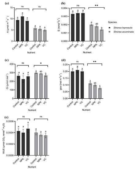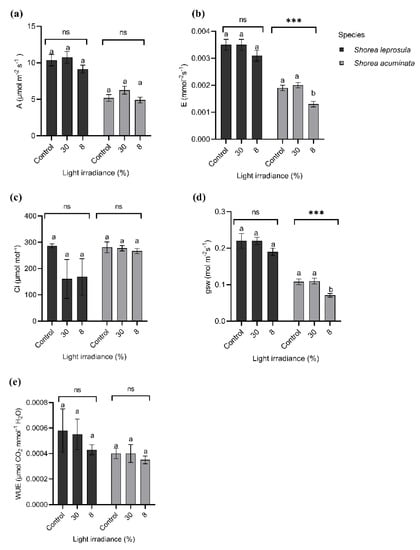Shorea leprosula Miq. and Shorea acuminata Dyer gas exchange characteristics in different light irradiances (mean ± SE); (a) photosynthesis rate (A, µmol m−2 s−1); (b) transpiration rate (E, mmol−2 s−1); (c) intercellular carbon concentration (Ci, µmol mol−1); (d) stomatal conductance (gsw, mol m−2 s−1); (e) and water-use efficiency (WUE, µmol CO2 mmol−1 H2O). Alphabets denote significant differences between light irradiance treatments with *** indicating significant at p < 0.001, respectively; ns = non-significant.