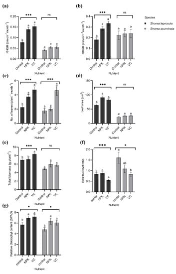 The growth performance of Shorea leprosula Miq. and Shorea acuminata Dyer to different nutrient amendments; (a) relative height growth rate (RHGR) (cm cm−1 month−1); (b) relative diameter growth rate (RDGR) (mm mm−1 month−1); (c) mean number of leaves (plant−1 month−1); (d) leaf area (cm2); (e) biomass (g plant−1); (f) root-to-shoot ratio; and (g) relative chlorophyll concentration (SPAD) (Mean ± SE). Alphabets denote significant differences between light irradiance treatments with *, and *** indicating significant at p < 0.05, and p < 0.001, respectively; ns = non-significant.