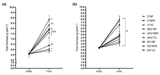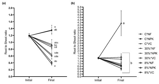 The interaction between light and nutrients showed 8% irradiance × VC (8%*VC) obtained the highest total biomass for S. leprosula (Figure 8a), while the control treatment C × NF (100% irradiance × no fertiliser) had the lowest total biomass. As for S. acuminata, the highest total biomass was obtained using C × NPK, while the lowest was the 30% × NPK (Figure 8b). However, the differences were not significant in S. acuminata. The root-to-shoot ratio showed the highest value in C × NPK and C × NF (control), while the lowest root-to-shoot ratio for S. leprosula was observed in 8% × VC (Figure 9a). Shorea acuminata showed the highest root-to-shoot ratio in the control treatment (C × NF) and the lowest in 8% × NPK (Figure 9b).