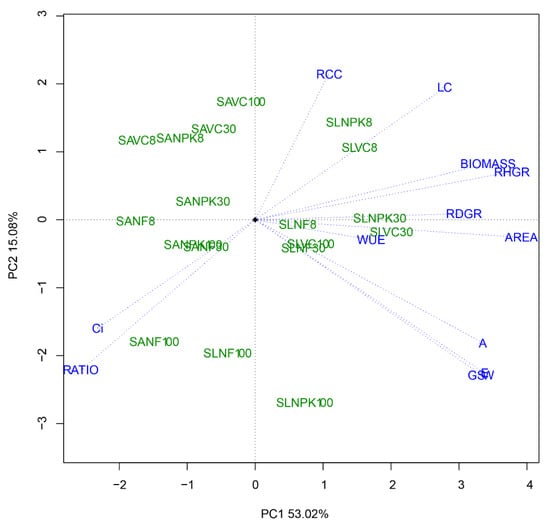 Principal component analysis (PCA) biplot for two Shorea species, S. leprosula (SL) and S. acuminata (SA), growing under different levels of light irradiance (8%, 30%, 100%) and nutrient amendments (NF, NPK, VC). Growth responses: relative height growth rate (RHGR) (cm cm−1 month−1), relative diameter growth rate (RDGR) (mm mm−1 month−1), mean number of leaves (LC) (plant−1 month−1), leaf area (AREA) (cm2), biomass (g plant−1), Root-to-shoot ratio (RATIO), and relative chlorophyll concentration (RCC) (SPAD). Gas exchange measurements: photosynthesis rate (A, µmol m−2 s−1), transpiration rate (E, mmol−2 s−1), stomatal conductance (gsw, mol m−2 s−1), water-use efficiency (WUE, µmol CO2 mmol−1 H2O), and intercellular carbon concentration (Ci µmol mol−1).