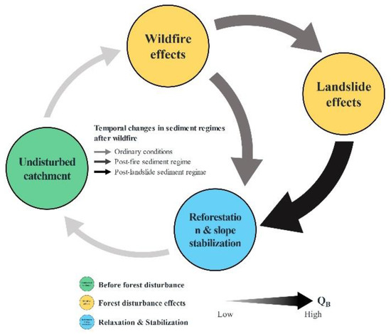 Conceptual diagram of temporal changes in sediment transport regimes in the fire-disturbed catchment. The thickness of the arrows indicates the magnitude of the sediment discharges (QB).