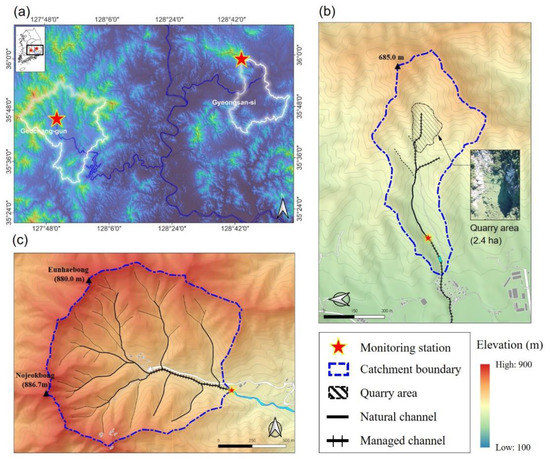 The unburned catchment with an area of 139.7 ha is located upstream of the Geumho River (latitude: 35°59′10′′ N, longitude: 128°44′38′′ E), a tributary of the Nakdong River that runs through the southern part of the Korean Peninsula (Figure 2a,c). Geologically, the catchment consists of granite, with the representative rock formations being biotite granite and amphibole biotite granite. The soil type in the study catchment is dominantly sandy loam. The ridges of Nojeokbong (886.9 m above sea level) and Eunhaebong (897.6 m above sea level) to the east of Mount Palgong (1192.9 m above sea level) formed a catchment, and granite outcrops were revealed at the ridges at 800.0 m or higher above sea level. The unburned catchment has a humid continental climate (Köppen Dwa), with a mean annual temperature of 13.2 °C. The average annual precipitation in this area is 1231.3 mm, with 69.2% of the annual precipitation falling during the rainy season from June to September (based on precipitation records from 1997 to 2021 at the Sinnyeong Automatic Weather Station).