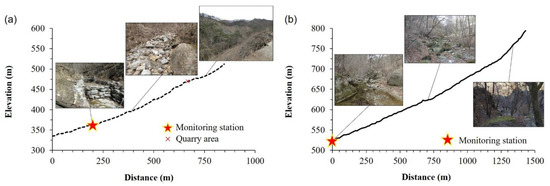 Post-fire monitoring of bedload transport was performed in the southern part of the Korean Peninsula (Table 1 and Figure 2). The burned catchment is located upstream of the Hwang River in Geochang-gun (latitude: 35°45′3′′ N, longitude: 127°52′1′′ E), where the humid continental climate (Köppen Dwa) prevails with a mean annual temperature of 12.4 °C. It is a small-scale mountainous catchment with an area of 30.8 ha (Figure 2a,b). The average annual precipitation in this area is 1460.2 mm, with 69.5% of the annual precipitation occurring during the rainy season from June to September (based on precipitation records from 1997 to 2021 at the Buksang Automatic Weather Station managed by the Korea Meteorological Administration). Geologically, the catchment consists mainly of granite, with biotite granite being the representative rock formation. The soil type is dominantly sandy loam. Until the early 2000s, soil and rocks were collected approximately 400.0 m upstream of the monitoring point. The damaged area was approximately 2.4 ha, but was restored in the mid-2000s. Topographically, the catchment is characterized by a steep slope with an average angle of 32.4°. In particular, the incision slope of the quarry area and the rocky slope of the catchment showed an angle of more than 60.0°.
