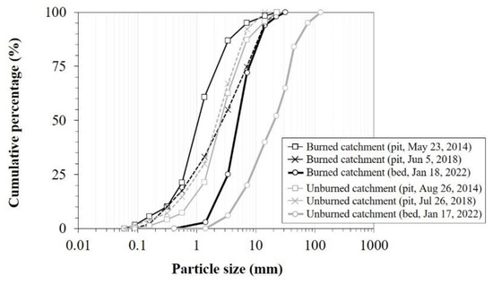 The effect of changes in supply conditions on the bedload transport characteristics of the burned catchment was also confirmed by the particle size of the pit deposits (Figure 4). Samples were taken on 23 May 2014 and 5 June 2018 at a depth of 0.1 m from the surface. In addition, sediment was removed from inside the pit for system maintenance in early March of each year. Therefore, it is likely that the acquired sample was transported during the rainfall event of the dry season and was accumulated in the upstream tributary and streambed after the rainy season of the previous year ended. The sediment particle size was investigated through sieve analysis after transferring the samples to the laboratory and drying them in an oven. The sand and fine gravel content in the sample obtained on 23 May 2014 was higher than that in the sample on 5 June 2018. The D50 values of each sample were 1.07 and 4.85 mm, respectively. Thus, the former was 4.5 times finer than the latter. The high proportion of fine fractions in the 2014 sample was attributed to the fire-accelerated catchment erosion process [13,23,24,25].