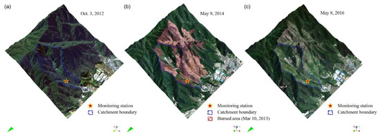 Comparison of aerial views before and after the wildfire in the burned catchment (10 March 2013). (a) The aerial view taken on 3 October 2012 shows that most forests in the catchment area were logged after the wildfire. (b) This is observed in the aerial view taken on 9 May 2014. (c) In the aerial view taken on 8 May 2016, most bare slopes were covered with ground cover, but the surface of the steep upstream slopes and quarry areas was still exposed.