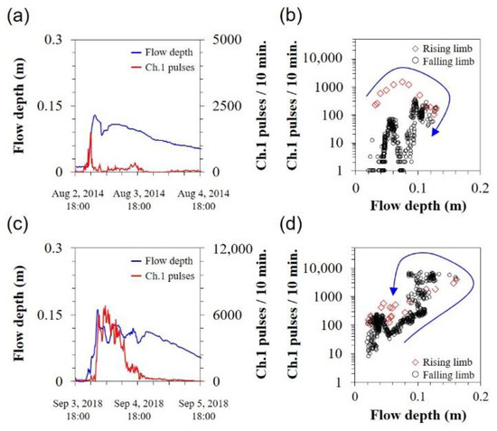 Flow depth and pulse values measured by the hydrophone’s Ch.1 registered on (a) 2 August 2014 and (c) 4 September 2018 rainstorms in the burned catchment. In the former event, the (b) bedload peak occurred before the peak flow depth, creating a clockwise hysteresis, whereas, in the (d) latter event, the peak of bedload transport occurred after the peak flow depth, producing a counterclockwise hysteresis.