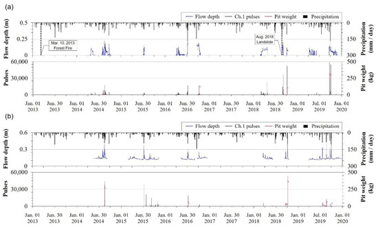 In this study, we monitored the temporal changes in the precipitation (mm), flow depth (m), hydrophone pulse (Ch.1 pulse), and pit sampler load (kg) (Figure 7). We expressed all data in the graph as the average (flow depth and sampler load) or sum (precipitation and Ch.1 pulse) of 1 min interval measurements recorded for 1 h. Monitoring results also included intermittent and long-term missing data due to electrical and mechanical problems. For example, monitoring was simultaneously stopped in 2017 in both catchments for repair and replacement of damaged devices.