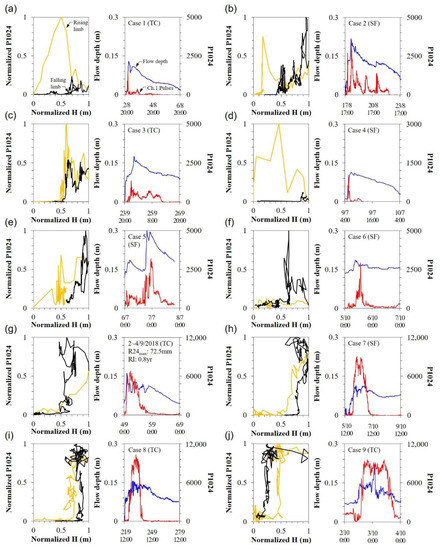 Depth-pulse relationship in rainstorm events in the unburned catchment. The bedload hysteresis relationships were divided into clockwise patterns in (a–c,g–i), and (j) and counterclockwise patterns in (d–f), and (h).