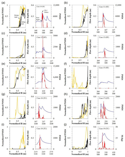 In this study, differences in sediment availability between burned and unburned catchments were examined by interpreting the rainstorm event on 17 August 2014, which occurred at approximately the same time in both catchments. In cases 2 and 10, rainstorms occurred at approximately 18:00 on 17 August 2014 and 20:00 on 17 August 2014, respectively, with similar intensities and magnitudes in the two catchments (see Table 3). The peak flow depths were 0.22 and 0.39 m in the burned and unburned catchments, respectively, which were approximately 1/5 of the bankfull stage (See Figure S3 in Supplementary Materials). During the rainstorm on 17 August 2014, the Ch.1 pulse of the burned catchment reacted simultaneously with the increase in flow depth (approximately 0.02 m) at approximately 17:00 on August 17, and immediately after the observed peak flow (normalized H = 1.0), on August 18, which reached its maximum (normalized P1024 = 1.0) at approximately 09:00 (Figure 8b). In contrast, the Ch.1 pulse of the unburned catchment reacted at nearly half of the peak flow depth (normalized H = 0.5, approximately 0.20 m) and was decreased at approximately 10:00 on August 18, before the flow depth reached its maximum (Figure 9a). This pulse response revealed differences in the critical discharge that initiated bedload transport at each monitoring point [61]. The differences in the initiation conditions of bedload movement were not limited to the rainstorm event on 17 August 2014. In the last rainstorm events in 2014 and 2015, 1–2 years after the wildfire (cases 1, 2, 3, and 4), the Ch.1 pulses in the burned catchment were rapidly increased at the beginning of the flood (approximately 0.02–0.04 m) (Figure 8a–d). In contrast, the pulse response of the unburned catchment tended to increase at 1/2–4/5 of the peak depth (normalized H = 0.5–0.8), that is, near the peak of the flood (0.23–0.28 m) in most cases.