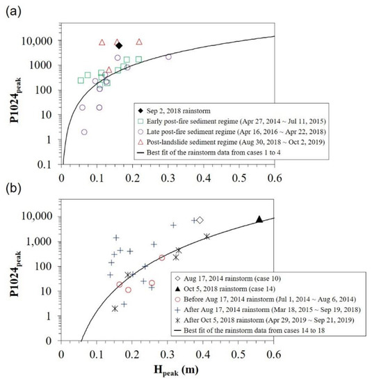 The bedload transport rates of burned catchments were further improved after the August 2018 landslide. As a whole, the peak bedload discharge (Mpeak) and peak pulse values in the rainfall events after the landslide were found to be 1–2 orders of magnitude higher than those in the data before the landslide at a similar peak flow depth (Figure 10a). This was consistent with the reports of Schuerch et al. [71], and Kanbara [72], who observed a transient increase in the transport rate after episodic supply events (e.g., large floods, landslides, and debris flow) in sediment observation studies of mountain streams.