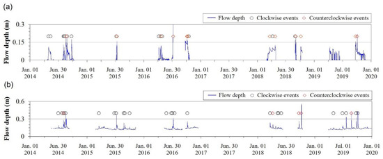 We examined the bedload hysteresis relationship using 54 rainfall events with good hydrophone responses (Figure 11). In the burned catchment, we identified hysteric patterns in the flow depth-pulse relationship in the clockwise direction in 14 cases, whereas in the counterclockwise direction in 12 cases (Figure 11a). However, we could not determine the dominant hysteresis pattern of the monitoring period because of missing data. In 2014, 1 year after the fire, we observed a dominant clockwise hysteresis pattern with decreasing pulse response before the peak flow depth at 87.5%. In 2016, however, we identified both a clockwise and counterclockwise pattern, with the counterclockwise pattern increasing to 67.7% in 2018. In contrast, in the unburned catchment, we identified 24 and 5 cases of hysteric patterns in the clockwise and counterclockwise directions, respectively, with the occurrence of clockwise hysteresis patterns accounting for 82.8% (Figure 11b). When the burned catchment monitoring during the year 2013, right after the wildfire, was excluded, the fire impact was estimated to be strongest during the 2014 rainy season [9,14,16,17]. However, the hysteric loop of the flow depth-pulse relationship was not discriminated between the burned and unburned catchments.