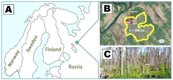 Location of the forest area burnt and sample plots (SP) in the Vodlozersky National Park (A,B). View of the spruce forest after the fire in 2011 (C).