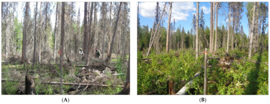 Pristine spruce forest burnt by high-severity fire in SP 9 in 2014 (A) and in 2020 (B).