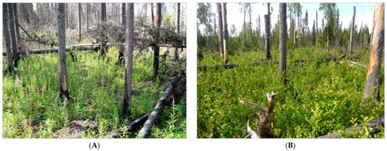 The duration of the post-fire vegetation regeneration period depends on the site conditions and fire severity [18,19,20,21]. In the boreal zone, the species diversity of vascular plants and wood-decaying fungi usually reaches a maximum 10–15 years after the fire [22,23,24,25,26,27]. Communities in a regeneration stage can comprise species of vascular plants, insects and fungi with fire-associated life cycles [28]. Nowadays, the technological development and availability of high-resolution geospatial data leads to an easy assessment of vegetation recovery and forest succession trends with remote sensing [29,30].
