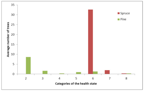Distribution of spruce and pine by health categories. 2—weakened, 3—heavily weakened, 4—dying, 5—current-year dead standing, 6—previous-years (old) dead standing, 7—uprooted, 8—wind-snapped.