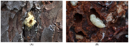The stands were examined for colonization by wood borers in 2014 in three temporary sample plots. The samples were designed as circular plots with 12.62 m radius, which corresponds to 500 m2 area [69]. The stand condition was evaluated by inventorying trees by species, diameter classes, and health category (1, 2—healthy; 3, 4—weakened; 5—current-year dead standing; 6—old dead standing; 7—uprooted; 8—wind-snapped) with special focus on trees inhabited or abandoned by pests [70]. Trees of all health categories were examined for signs of wood borer infection, such as pitch tubes, entrance and emergence holes in bark, tunneling, as well as larvae and adult insects under bark, frass or sawdust on bark, under bark and around the base of the tree.