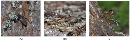 Apart from wood borers, which cause tree die-back, the burnt area was populated by a wide range of other species associated directly or indirectly with deadwood. This is, first of all, the group of coleopterans that colonize weakened or recently died-back trees. Pine and spruce trees carried quite a lot of larvae of Rhagium inquisitor L. and Pytho depressus L., and spruce also harbored adult Callidium coriaceum Paykull (Figure 7A) and larvae of Diacanthous undulatus De Geer. Quite abundant were horntails Sirex juvencus L. and Xeris spectrum L. (Figure 7B). At the time of the survey, the burnt area was already colonized by other insects, superseding the first settlers. Quite common among them were predaceous beetle species (Thanasimus formicarius L. and Th. femoralis Zett.) and dipterans (members of the families Asilidae, Hybotidae, Pallopteridae), as well as various parasitic hymenopterans. Noteworthy representatives of the latter were large ichneumon wasps Megarhyssa rixator Shell. (Figure 7C) and Rhyssa persuasoria L., which infect horntail larvae. We also observed the smaller Ephialtes manifestator L., Ischnoceros rusticus Geoffr., Neoxorides montanus Oehlke, Xorides ater Grav., X. irrigator F., Odontocolon spinipes Grav. (Ichneumonidae), Atanycolus spp. and Helconidea dentator F. (Braconidae) and other species that parasitize longhorn beetles of genera Monochamus, Callidium, Tetropium, etc.
