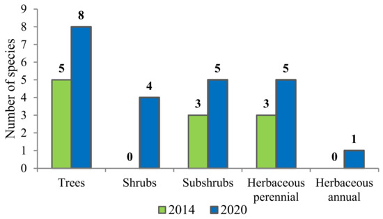 In 2014, species of three life forms were represented among vascular plants in the burnt area (Figure 8): the woody and semi-woody plant group prevailed (72.7%). No shrubs were encountered. Among herbaceous life forms, only light-loving perennial herbaceous plants were present, such as Avenella flexuosa, Chamaenerion angustifolium, and Luzula pilosa. By the end of the first post-fire decade, the diversity of plant life forms in the burnt area gradually increased—there appeared shrubs and annual herbs.