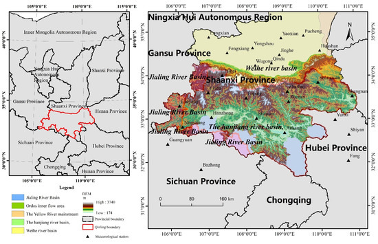The study area mainly covers the hinterland of the Qinling Mountains in Shaanxi. It is bounded by the administrative unit near the ridge line in the north, some areas of Hanjiang River in the south, and the boundary of Shaanxi province in the east and west (Figure 1). The geographical coordinates range from 105°42′44″–111°3′29″ E, 32°28′31″–34°40′59″ N, with a total area of about 61,726.83 km2. The obvious characteristics of this area are that the northern and southern slopes are quite different, and the intensity of human activity has obvious spatial differences [38]. The ecological environment of the Qinling Mountains’ vegetation and watershed is affected by climate change and human activities. The influence of climate change in the Qinling mountains has a certain change rule in the horizontal and vertical directions [39].