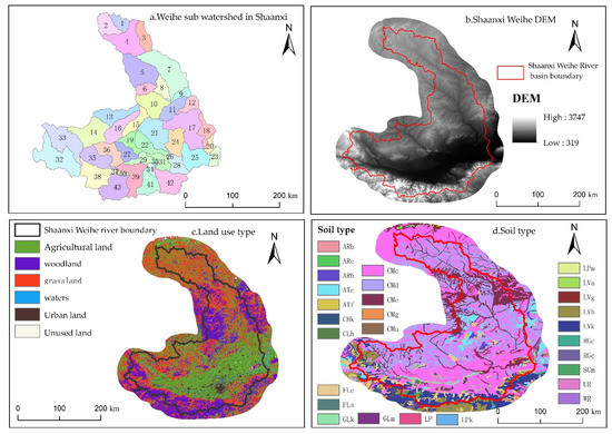 The sub-basins and hydrological response units (HRUs) were divided. According to the actual situation of the basin, the upper reaches of the Hanjiang River basin were divided into 109 sub-basins (Figure 2a) and 5051 HRUs. The Weihe River basin in Shaanxi province was divided into 53 sub-basins (Figure 3a) and 2352 HRUs. Second, the soil database was constructed according to the soil types in the study area.