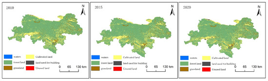 Land-use types of Qinling Mountains in 2010, 2015, and 2020.