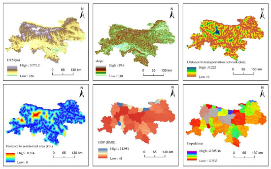The PLUS model was used to predict land-use/-cover changes in the Qinling Mountains. The data of influencing factors include the DEM, slope data, distance to the transportation network, distance to residential areas, GDP spatial distribution data, and population spatial distribution data. After buffer-zone analysis, projection conversion, and other processing, the driving factor dataset was obtained (Figure 5).