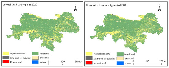 Using 2020 as the validation year, by comparing actual land-use type data and simulation data in 2020 (Figure 6), and setting the adoption rate to be 0.1, the Kappa coefficient was calculated to be 0.6432, and the overall accuracy was 0.7567.