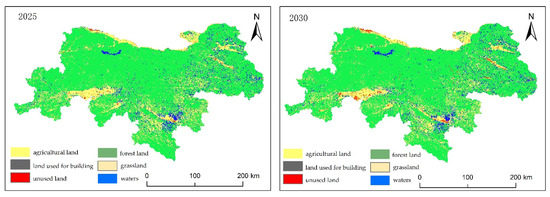 After model validation, a Markov chain was used to predict land-use types in 2025 and 2030 (Figure 7). Comparing the prediction results with 2020 land-use data (Table 5) shows that the main land-use types in the Qinling Mountains are forestland, agricultural land, and grassland. The reduction in agricultural land is obvious. Forestland increased more, grassland decreased more, and the fluctuation of the water area was large. Construction land decreased first and then increased. Unused land gradually decreased. The main transfer types of forest land were grassland and agricultural land, and the main transfer types of construction land were agricultural land, unused land, and grassland.