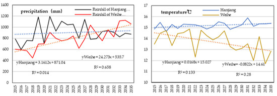 The paper uses future climatic prediction results and a land-use scenario simulation to predict future runoff changes. For the prediction of future climatic data, the annual change trends of temperature and precipitation in the Weihe River and Hanjiang River basins from 2022 to 2035 simulated with the BCC/RCG-WG weather generator are shown in Figure 8. The dot line in the Figure 8 represents the trend of annual average temperature and annual precipitation. The future change trends of temperature and precipitation in the two basins show that the precipitation had an upward trend, and the increase trend of precipitation in the Weihe River was significantly greater than that in the Hanjiang River (Figure 8). From the change trend of temperature, the temperature of Hanjiang River shows an insignificant rise, while the temperature of Wei River shows an insignificant decline. The temperature trend shows that the temperature difference between the two basins is gradually increasing (Figure 8), while the precipitation difference is not obvious.