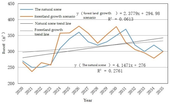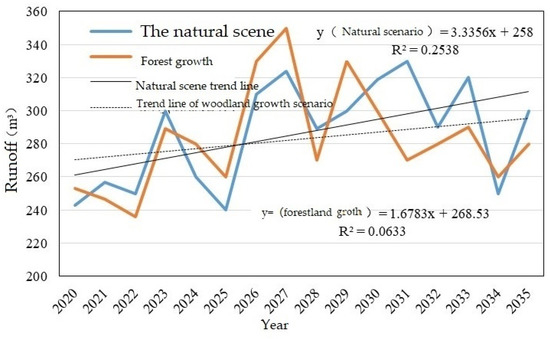 The future change trends of the watershed under different scenarios show that the future runoff change of the Qinling Mountains had an increasing trend, while the increase degree of runoff under the natural development scenario was higher than that under the forestland growth scenario, and the increase degree of runoff in the Hanjiang River basin was higher than that in the Weihe River basin as a whole. Therefore, blindly increasing the area of forestland in the Qinling Mountains cannot achieve a better hydrological effect.