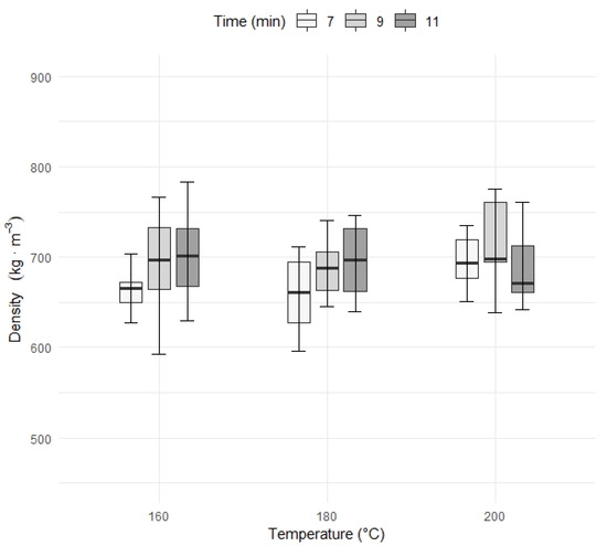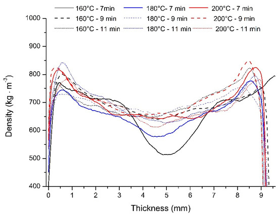 | Temperature (°C) | Time (min) | Density (kg∙m−3) | Thickness (mm) | ||