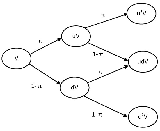 where is the upward multiplicative factor, is the downward multiplicative factor, is the probability of upward movement, is the volatility of stochastic prices, is the time interval or the step size, and is the risk-free interest rate [15]. The upward and downward movements are used to develop a binomial tree as seen in Figure 1, where is the value of the investment.