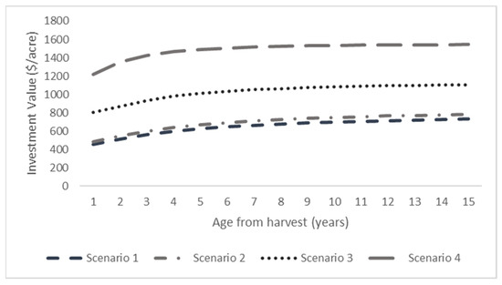 The parameter estimates for the valuation options estimation for the four scenarios are reported in Table 3. The investment value represents the present value of harvest at the estimated rotation age. The investment cost is the present value of the total production cost under each management system. For the two thinning scenarios, thinning revenues were subtracted from the total production cost to estimate the investment cost. The rotation age represents the economically optimal rotation age for each scenario when the LEV is maximum considering timber benefits only. The risk-free rate is set to 4% and the time of expiration of the option is 15 years. The expiration date of 15 years represented the age when the marginal growth of volume turns negative.