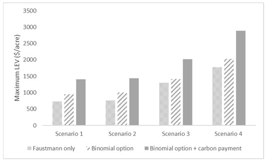 Figure 4 presents the maximum LEVs for the four scenarios based on three different estimation methods: Faustmann only, binomial option, and binomial option with carbon payment for delayed harvest. As expected, the inclusion of stochastic stumpage prices through the binomial option resulted in higher LEVs for all scenarios. LEV for scenario 1 increased by $226 (31%) for the binomial option model compared to the Faustmann only model and $675 (92%) for the binomial option with the carbon payment model. Scenario 2 had similar increment with $247 (32%) and $675 (89%) for the binomial option and binomial option with carbon payment model, respectively. Comparatively, scenario 3 had the lowest increment in LEV under the binomial option model with $118 (9%). Scenario 4 had the highest increment in LEV under both binomial option and binomial option with the carbon payment model with a $252 (14%) and $1103 (62%) increase, respectively.