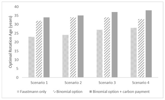Figure 5 presents the optimal rotation age for the four scenarios under three estimation models. The rotation age was higher in all scenarios under the binomial option with carbon payment model compared to just the binomial option model. The rotation age was highest for scenario 4 with 38 years for the binomial option with the carbon payment model. While rotation age was lowest for scenario 1 with 32 years under the binomial option model and 34 years under the binomial option with the carbon payment model.