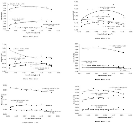Apart from N, the contents of all elements in the leaves showed a downward trend with an increase in the density of the substrate in which the seedlings grew (Table 3). This dependence was especially visible in the cases of Mg and P, where the coefficients of determination (R2) were 0.88 and 0.87, respectively (Figure 1). The N content in the leaves was highest in the V3 variant, which differed significantly from the extreme density variants, V1 and V9, in which it was the lowest (Table 3).