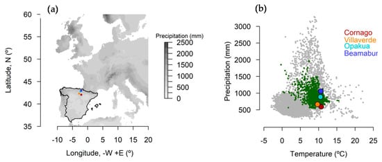 (a) Location of the four study sites in northern Spain and (b) climate niche space of Douglas fir in North America (grey points), Europe (green points) and the four studied sites (color points) based on annual climate data (mean temperature, total precipitation). Note that the Cornago and Villaverde sites are subjected to drier conditions than the Opakua and Beamaburu sites.