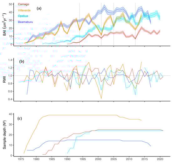 Basal area increment ((a), BAI) and ring width index ((b), RWI) for Douglas fir in the four studied sites. For BAI, solid lines represent mean values across individuals and shaded areas are the 95% confidence intervals for the means. The lowest plot (c) shows the sample depth (number of cores). In the uppermost plot, the dotted vertical lines show dry years (1994, 2001, 2005 and 2012).