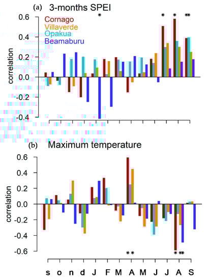 Relationships (Pearson correlations) between Douglas fir growth and climate. The relationship between ring-width indices of Douglas fir 2014 with 3-month-long SPEI (a) and the mean maximum temperature (b) is represented with different colors for each site. Asterisks (*) indicate significant (p < 0.05) correlations for each site (colors) in that month (lowercase letters for the previous year and uppercase letter for the current year).