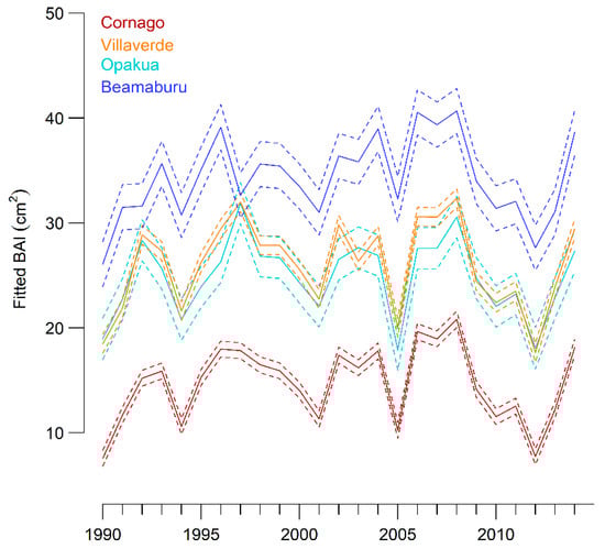 Expected growth (BAI, basal area increment) of Douglas fir trees for the period 1990–2014 if all sites are hypothetically forced to have the same age (i.e., standardized mean age values are 0). Continuous lines are means and dashed lines are 95% confidence intervals.